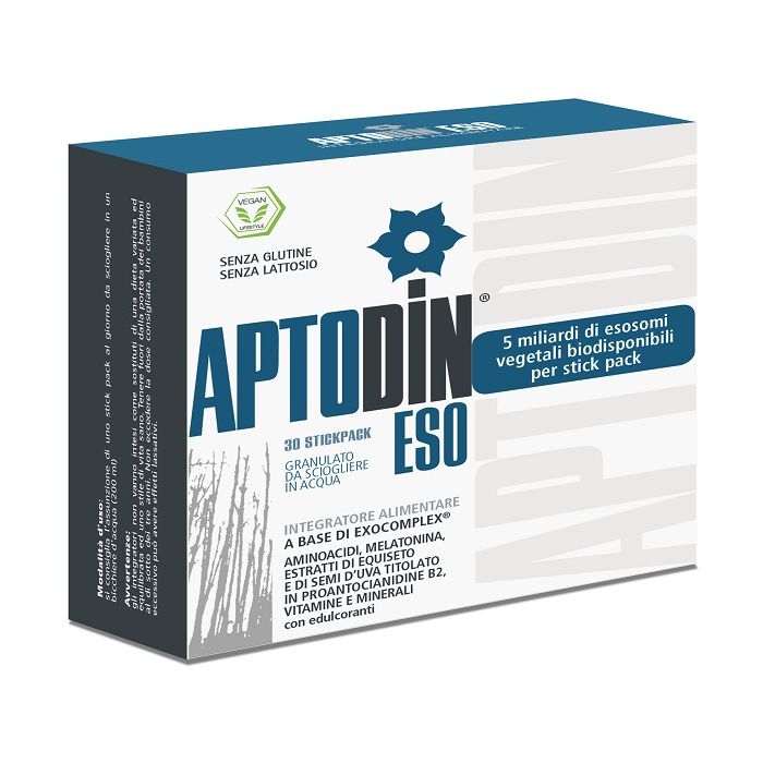 APTODIN ESO contiene: Exocomplex, 5 miliardi di esosomi vegetali; aminoacidi: L-cistina, L-metionina, L-arginina (costituenti della cheratina presente nella struttura dei capelli) e taurina; melatonina; equiseto utile per il benessere dei capelli e delle unghie; estratto di semi d’uva, antiossidante, titolato in proantocianidine B2; vitamina B6 contribuisce alla regolazione dell’attività ormonale; vitamina B5 contribuisce al normale metabolismo degli ormoni steroidei; zinco e selenio contribuiscono al mantenimento di unghie sane e con la biotina al mantenimento dei capelli normali; il ferro contribuisce alla protezione delle cellule dallo stress ossidativo e alla normale funzione del sistema immunitario.