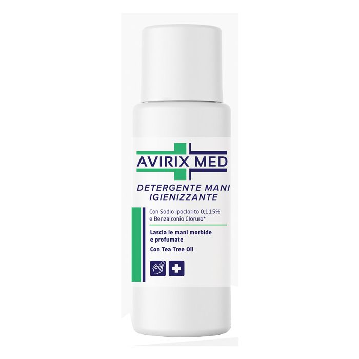 Avirix Med è un detergente cosmetico per le mani che pulisce, igienizza ed aiuta a preservare lo stato di pulizia delle mani. Con sodio ipoclorito 0,115% e benzalconio cloruro (preservante). Con tea tree oil.