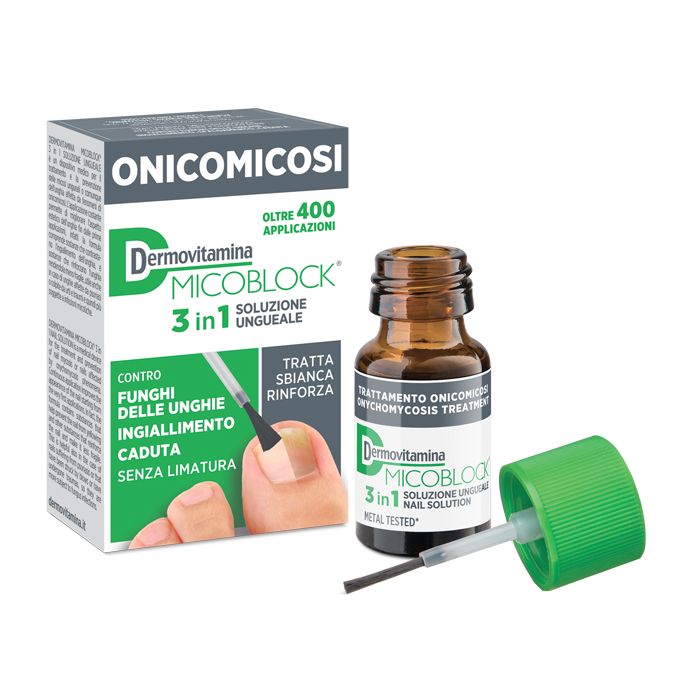 DERMOVITAMINA MICOBLOCK 3 in 1 ONICOMICOSI SOLUZIONE UNGUEALE non è uno smalto. Se lo si desidera, è possibile applicare sul suo film protettivo uno smalto cosmetico (dopo almeno un’ora dall’applicazione). Prima di riapplicare rimuovere eventuali smalti cosmetici per consentire la penetrazione del prodotto.