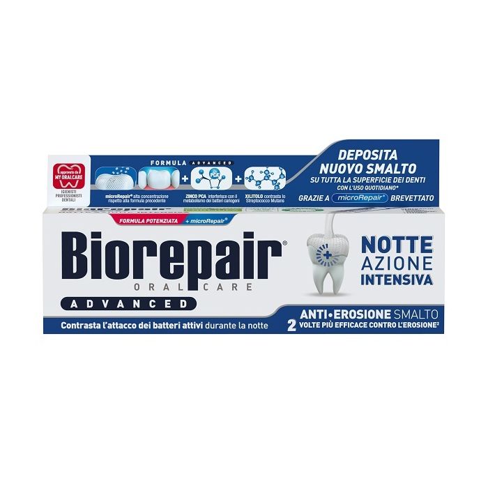 La formula avanzata Biorepair Intensivo Notte Anti-Erosione è potenziata per contrastare il processo di demineralizzazione dello smalto dei denti che avviene durante la notte. I microRepair, presenti in alta concentrazione, si depositano sullo smalto riparandolo e proteggendo la superficie dei denti dall'erosione notturna. Zinco, PCA e xilitolo contrastano insieme l'attività aggressiva degli acidi dei batteri, principale causa di demineralizzazione, placca, tartaro e carie. Inoltre lo speciale aroma stimola il flusso salivare notturno per una protezione naturale dello smalto e un alito più fresco al risveglio.