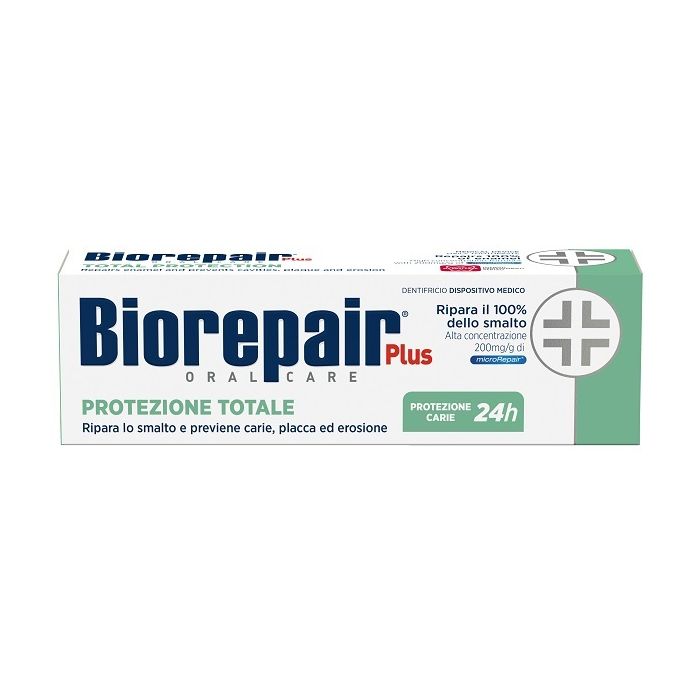 Cibi acidi e i batteri causa di placca, tartaro e carie sono i principali responsabili dell'erosione dei denti, la cui salute può essere protetta ogni giorno con Biorepair Plus Protezione Totale, il miglior alleato per la protezione dei tuoi denti grazie ai microRepair, microparticelle attive in grado di penetrare nelle microscalfitture del dente, riparare lo smalto danneggiato e occludere i tubuli dentinali scoperti. Formulazione arricchita con Zinco PCA per contrastare la proliferazione batterica. Ideale per chi soffre di alitosi.