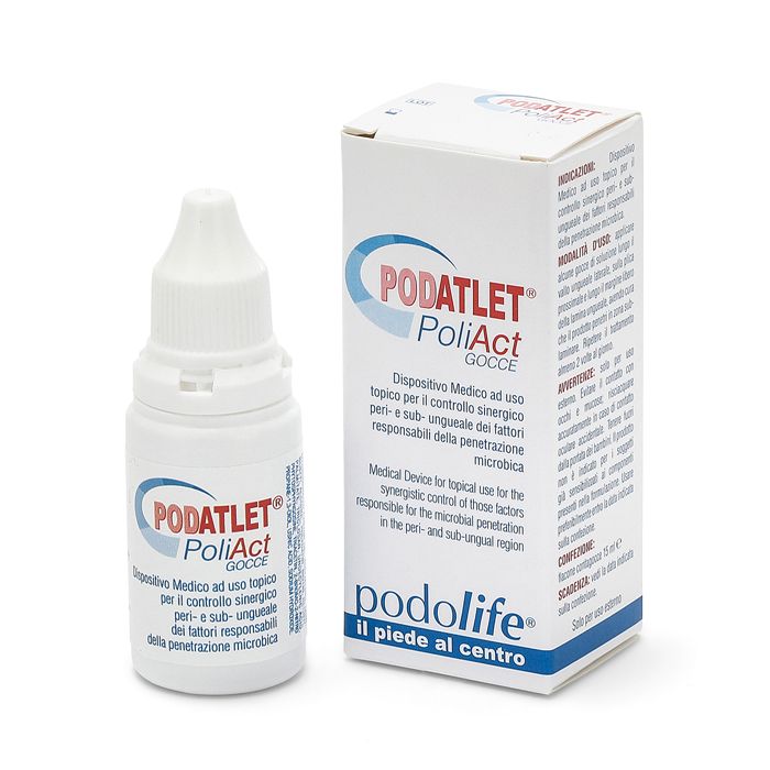 Componente rilevante e frequente della Tinea Pedis (Piede d’Atleta). L’onicomicosi è un’affezione dell’unghia molto comune che colpisce all’incirca il 20% della popolazione; nei pazienti di età superiore ai 60 anni l’onicomicosi raggiunge percentuali molto più elevate, tra il 50 e il 75%. Sono stati individuati numerosi fattori di rischio che predispongono all’onicomicosi; molti di questi fattori sono caratteristici di soggetti anziani (neuropatie periferiche, ischemia, stasi venosa, tromboflebite cronica, diabete, ipertensione, ecc.). Anche nel soggetto giovane e adulto, l’uso crescente di calzature ad insufficiente traspirazione, la frequentazione di arenili infetti, di piscine, di docce, ecc. costituiscono fattori di rischio crescente per le infezioni micotiche dell’unghia. La penetrazione del micete dipende dal grado di reattività dei tessuti dermo-epidermici che compongono l’apparato ungueale (letto ungueale, matrice ungueale, iponichio, ecc.). Tali manifestazioni si accompagnano frequentemente a condizioni di trofismo dell’unghia con alterazione di forma, colore, struttura (onicodistrofia). Le sostanze contenute in PODATLET PoliAct GOCCE, agiscono in maniera sinergica e sincronica sia sul controllo del grado di reattività dei tessuti cutanei e mucocutanei (attraverso precisi meccanismi biologici) equilibrando le naturali difese messe in atto dall’organismo per contrastare la penetrazione e la proliferazione dei miceti; sia sulla normalizzazione del trofismo ungueale. L’Adelmidrol regola l’attività del mastocita dermico; il complesso Acido Undecilenico - Fitosfingosina - Acido Usnico - Triclosan-Bronopol agisce da bio-inibitore della crescita microbica concorrendo, così, a limitare il rischio di onicomicosi; la Biotina e la Vitamina A regolano la differenziazione cheratinocitica; la Polidatina determina effetto antiradicali liberi e l’Urea contrasta l’ispessimento della lamina ungueale.