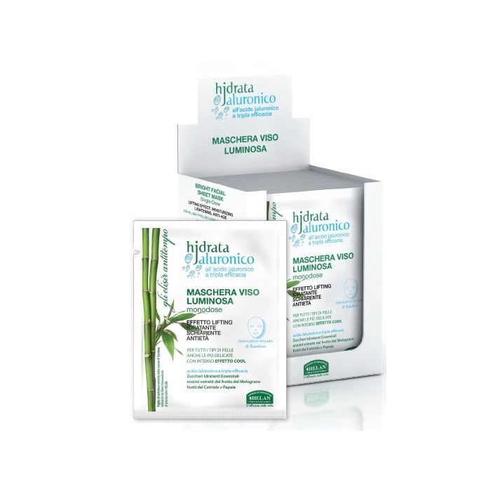 La Maschera è stata realizzata con un foglio di cellulosa estratta dalla canna di bamboo imbevuta di un siero concentrato di principi attivi formulato da HELAN. Grazie al suo design funzionale, il foglio impedisce una rapida evaporazione della fase acquosa e prolunga così il tempo di penetrazione. Oltre ad essere comoda e semplice da usare, questa maschera dall'intenso effetto rinfrescante, funge da incubatrice, trattenendo e proteggendo gli ingredienti attivi.L'abbinamento dell'acido jaluronico a tripla efficacia con gli enzimi e gli estratti, ricchi di vitamine e sali minerali, dai frutti di melograno, rigenerante e antietà, papaia, schiarente e lenitiva e cetriolo, rinfrescante e decongestionante, risulta particolarmente attivo per contrastare gli effetti dell'invecchiamento cutaneo: riducendo le rughe, donando un immediato effetto lifting, rivitalizzando la pelle, limitando le perdite d'acqua.