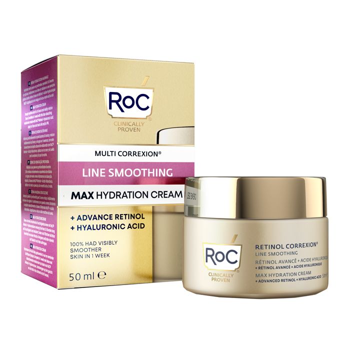 Crema idratante a rapido assorbimento formulata con Retinolo RoC e acido ialuronico per idratare la pelle in profondità per 24 ore e ridurre visibilmente le linee sottili e le rughe.