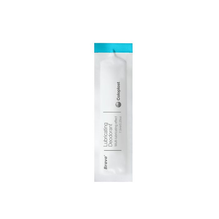 Brava Deodorante lubrificante maschera gli odori e garantisce che il contenuto rimanga sempre sul fondo della sacca e non attorno allo stoma. Inoltre, rende più facile svuotare la sacca. La bustina monouso è comoda da usare quando si è fuori casa o in viaggio.