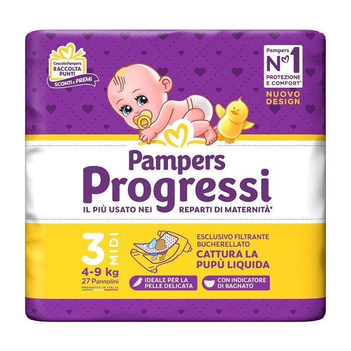 Il filtrante bucherellato cattura la pupù liquida. Il pannolino è dotato di indicatore di bagnato.