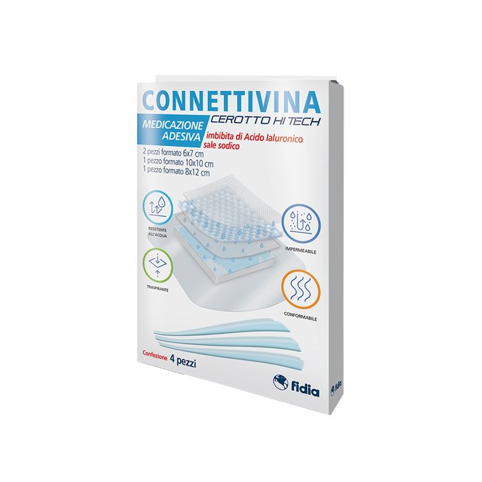 Connettivina cerotto Hi Tech è in grado di creare un ambiente umido nel sito di applicazione, protetto verso l'esterno, tale da favorire il naturale processo di riparazione tessutale in caso di escoriazioni, abrasioni, piccoli tagli, ferite superficiali, scottature.