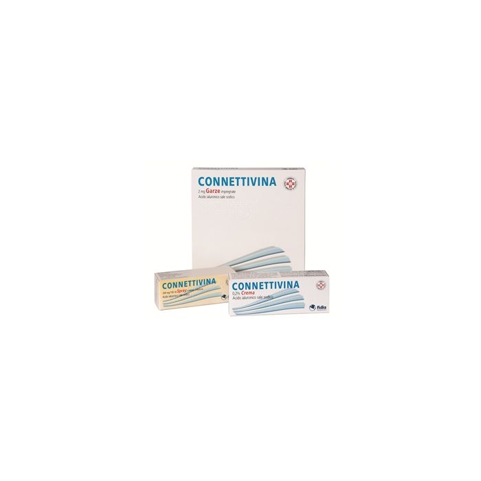 CONNETTIVINA 2mg/ ml Spray cutaneo, soluzione: 1 ml contiene 2 mg di Acido ialuronico sale sodico. Eccipienti con effetti noti: metil p - idrossibenzoato e propil p - idrossibenzoato. CONNETTIVINA 2 mg Garze impregnate: una garza da 10x10 cm è impregnata con 4 g di crema contenente 2 mg di Acido ialuronico sale sodico. CONNETTIVINA 4 mg Garze impregnate: una garza da 10x20 cm è impregnata con 8 g di crema contenente 4 mg di Acido ialuronico sale sodico. CONNETTIVINA 12 mg Garze impregnate: una garza da 20x30 cm è impregnata con 24 g di crema contenente 12 mg di Acido ialuronico sale sodico Eccipiente con effetti noti: polietilenglicole 4000. Per l’elenco completo degli eccipienti, vedere paragrafo 6.1