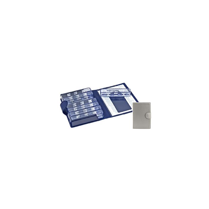 Pratico astuccio settimanale contenente 7 portapillole giornalieri, ciascuno dei quali munito di 3 pareti interne regolabili (4 spazi) per: mattino, mezzogiorno, sera, notte.