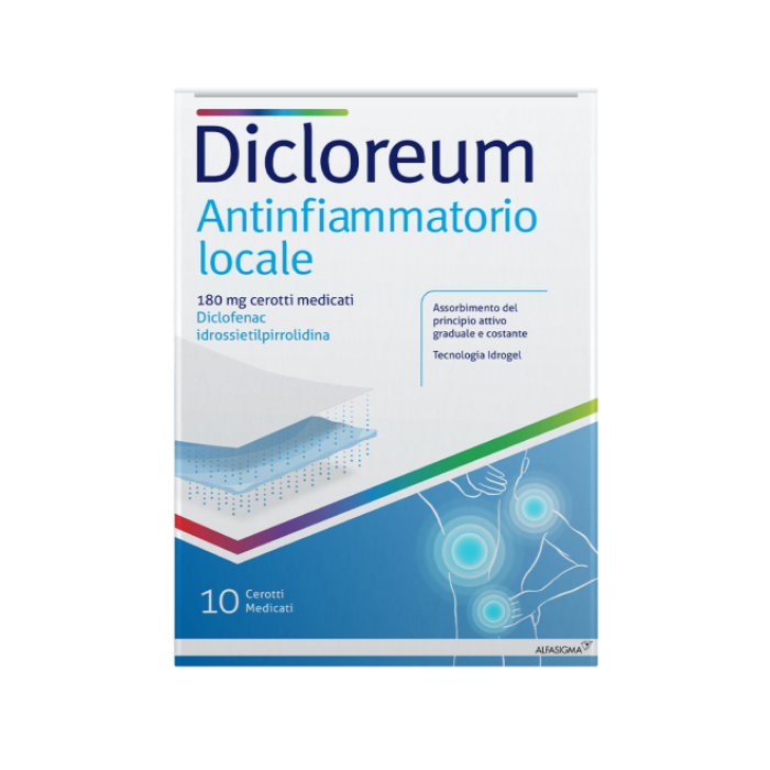 Se i cerotti medicati di diclofenac vengono utilizzati su superfici cutanee estese e per un periodo di tempo prolungato non è possibile escludere la possibilità di eventi avversi sistemici (consultare il Riassunto delle Caratteristiche del Prodotto delle formulazioni sistemiche di diclofenac). Il cerotto medicato deve essere applicato solo sulla cute intatta e sana e non deve essere applicato sulla cute lesa o su ferite aperte. I cerotti non devono entrare in contatto con gli occhi o le membrane mucose. Gli effetti indesiderati possono essere minimizzati con l’uso della più bassa dose efficace per la più breve durata possibile di trattamento che occorre per controllare i sintomi. - Non utilizzare con un bendaggio occlusivo che non lascia passare aria. - Il trattamento deve essere interrotto immediatamente se si sviluppa un rash cutaneo dopo l’applicazione del cerotto medicato. - Non somministrare contemporaneamente per via topica o sistemica un altro medicinale a base di diclofenac o altri FANS. - Sebbene gli effetti sistemici dovrebbero essere limitati, il cerotto medicato deve essere utilizzato con cautela in pazienti con compromissione renale, cardiaca o epatica, storia di ulcera peptica o malattia infiammatoria intestinale o diatesi emorragica. I farmaci antinfiammatori non steroidei devono essere utilizzati con particolare attenzione nei pazienti anziani che sono maggiormente predisposti agli effetti indesiderati. - I pazienti devono essere avvertiti di non esporsi alla luce solare diretta o alla luce delle lampade solari per circa un giorno dopo la rimozione del cerotto medicato in modo da ridurre il rischio di fotosensibilità. Dicloreum antinfiammatorio locale contiene: - metile paraidrossibenzoato (E218) e propile paraidrossibenzoato (E216) che possono causare reazioni allergiche (anche ritardate). - 420 mg di glicole propilenico per cerotto che può causare irritazione cutanea. - un profumo contenente a sua volta contenente allergeni (amile cinnamale, alcol amilcinnamilico, alcol benzilico, benzil benzoato, benzil salicilato, cinnammale, alcol cinnamilico, citronellolo, d-Limonene, eugenolo, farnesolo, geraniolo, aldeide exil cinnamica, idrossicitronellale, isoeugenolo, linalolo, metil eptin carbonato) che possono causare reazioni allergiche.