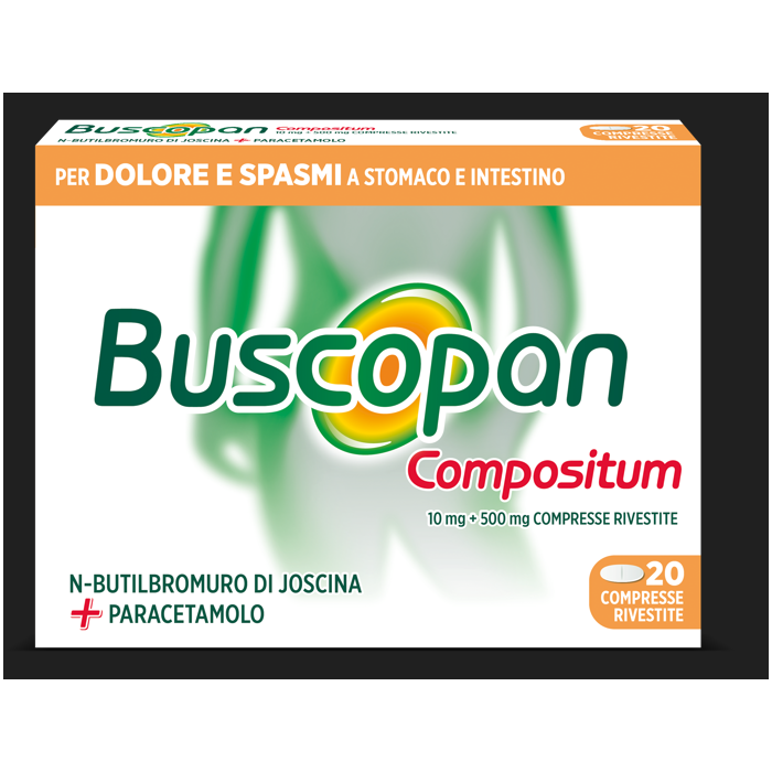 Buscopan Compositum non deve essere assunto per più di 3 giorni se non indicato dal medico. Invitare il paziente a rivolgersi al medico se il dolore persiste o peggiora, se si verificano nuovi sintomi, o se insorge rossore o gonfiore perché questi potrebbero essere sintomi di una grave condizione. Nel caso di dolore addominale grave di origine sconosciuta che persista, peggiori o sia accompagnato da sintomi quali febbre, nausea, vomito, alterazione dei movimenti intestinali, addome disteso, calo della pressione arteriosa, svenimento o sangue nelle feci, rivolgersi immediatamente al medico. Per prevenire il sovradosaggio, ci si deve assicurare che altri farmaci eventualmente assunti contemporaneamente non contengano paracetamolo, uno dei principi attivi di Buscopan Compositum. Può insorgere danno epatico se il dosaggio raccomandato per paracetamolo è superato (vedere il paragrafo 4.9). Buscopan Compositum deve essere usato con cautela in caso di: • insufficienza da glucosio-6-fosfato deidrogenasi; • disfunzione epatica (es. a causa dell’abuso cronico di alcol, epatiti); • uso cronico di alcol anche in caso di recente cessazione;• funzione renale compromessa; • sindrome di Gilbert; • insufficienza epatocellulare da lieve a moderata (Child - Pugh A/B); • basse riserve di glutatione. Somministrare con cautela nei soggetti con insufficienza renale od epatica. In tali condizioni Buscopan Compositum deve essere somministrato solo sotto controllo medico, se necessario, riducendo la dose o prolungando l'intervallo tra le singole somministrazioni. La conta ematica e la funzionalità renale ed epatica devono essere monitorate dopo l’uso prolungato. Il largo uso di analgesici, specialmente ad alte dosi, può indurre cefalea che non deve essere trattata con dosi aumentate di medicinale. Gravi reazioni di ipersensibilità acuta (es. shock anafilattico) sono osservate molto raramente. Il trattamento deve essere sospeso ai primi segni di una reazione di ipersensibilità in seguito alla somministrazione di Buscopan Compositum. Gravi reazioni cutanee: con l’uso di Buscopan Compositum sono state riportate reazioni potenzialmente fatali come la sindrome di Stevens-Johnson (SSJ) e la necrolisi epidermica tossica (NET). I pazienti devono essere informati circa i segni ed i sintomi e monitorati attentamente per le reazioni cutanee. Se si verificano i sintomi o i segni della sindrome di Stevens-Johnson, della necrolisi epidermica tossica (ad esempio eruzione cutanea progressiva associata a vesciche o lesioni delle mucose), il paziente deve sospendere immediatamente il trattamento con Buscopan Compositum e consultare un medico. Si può verificare epatotossicità con paracetamolo anche a dosi terapeutiche, dopo un trattamento di breve durata e in pazienti senza disfunzione epatica pre-esistente (vedere il paragrafo 4.8). Una brusca interruzione degli analgesici dopo un uso prolungato ad alte dosi può causare sintomi da astinenza (es. cefalea, stanchezza, nervosismo), che solitamente si risolvono entro pochi giorni. La riassunzione di analgesici deve essere subordinata al consiglio medico, e alla remissione dei sintomi da astinenza. A causa del potenziale rischio di complicazioni anticolinergiche, si deve usare con cautela nei pazienti predisposti al glaucoma ad angolo chiuso, nei pazienti soggetti ad ostruzioni delle vie intestinali o urinarie ed in quelli inclini alla tachiaritmia con turbe del sistema nervoso centrale autonomo, nelle tachiaritmie, nell’ipertensione arteriosa, nell’insufficienza cardiaca congestizia e nell’ipertiroidismo. Tutti gli antimuscarinici riducono il volume delle secrezioni bronchiali; pertanto essi debbono essere impiegati con cautela nei soggetti con affezioni infiammatorie croniche ostruttive dell’apparato respiratorio. Durante il trattamento con paracetamolo prima di assumere qualsiasi altro farmaco controllare che non contenga lo stesso principio attivo, poiché se il paracetamolo è assunto in dosi elevate si possono verificare gravi reazioni avverse, vedere paragrafo 4.2. Invitare il paziente a contattare il medico prima di associare qualsiasi altro farmaco. Vedere anche il paragrafo 4.5. Buscopan Compositum 10 mg + 500 mg compresse contiene 4,32 mg di sodio per compressa, cioè meno di 1mmole (23 mg) di sodio, quindi è essenzialmente “senza sodio”.