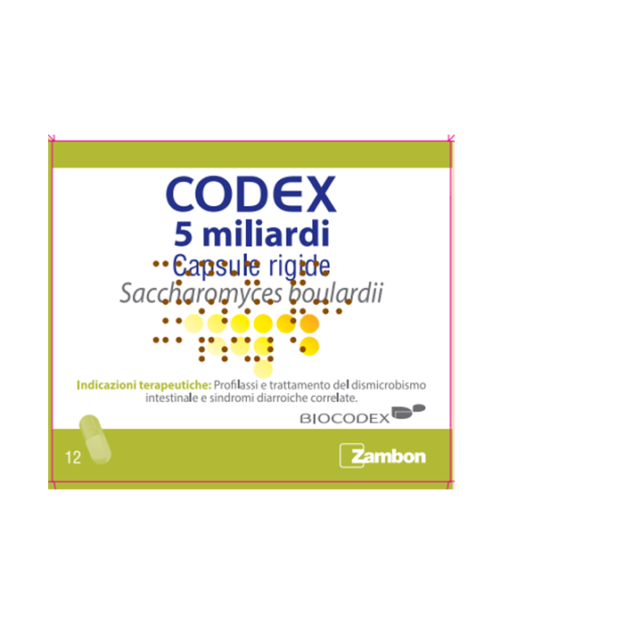 Non mescolare Codex con liquidi troppo caldi o con soluzioni alcooliche. In considerazione della natura fungina di Saccharomyces boulardii, Codex non deve essere somministrato durante la terapia antifungina topica o sistemica. Informazioni generali - Il trattamento della diarrea non è sostitutivo della reidratazione, quando necessaria. L’entità della reidratazione e la sua via di somministrazione devono essere commisurate alla gravità della diarrea e all’età ed allo stato di salute del paziente. - Si sono verificati casi molto rari di fungemia (ed emocolture positive per i ceppi di Saccharomyces) e sepsi per lo più in pazienti con catetere venoso centrale, malati in condizioni critiche o immunocompromessi, risultanti nella maggior parte dei casi in piressia. Nella maggioranza dei casi l’esito è stato soddisfacente dopo l’interruzione del trattamento con Saccharomyces boulardii, la somministrazione di un trattamento antimicotico e la rimozione del catetere, laddove necessario. Tuttavia, l'esito è stato fatale in alcuni pazienti in condizioni critiche (vedere paragrafo 4.3 e 4.8). - Come per tutti i farmaci a base di microorganismi vivi, è necessario prestare particolare attenzione durante la manipolazione del prodotto, principalmente in presenza di pazienti con catetere venoso centrale, ma anche in presenza di pazienti con catetere venoso periferico, anche se non trattati con Saccharomyces boulardii, al fine di evitare la contaminazione da contatto e/o la diffusione dei microorganismi per via aerea (vedere paragrafo 4.2). Informazioni importanti su alcuni eccipienti CODEX 5 miliardi capsule rigide - contiene lattosio. I pazienti affetti da rari problemi ereditari di intolleranza al galattosio, da deficit totale di lattasi, o da malassorbimento di glucosio-galattosio, non devono assumere questo medicinale - non contiene glutine.