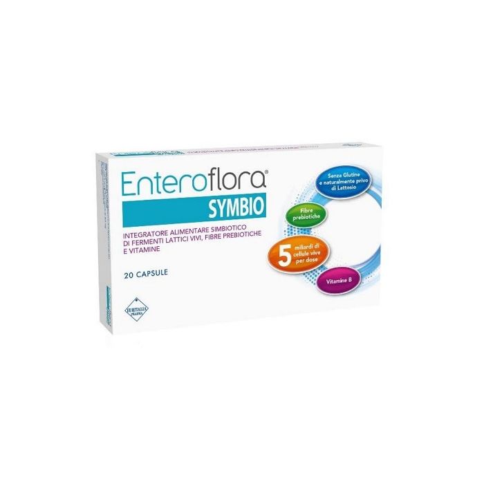 Contiene 4 ceppi di fermenti lattici vivi liofilizzati più frutto-oligosaccaridi ad azione prebiotica; l'apporto di queste sostanze ad azione simbiotica alla flora batterica intestinale è utile in casi di alterazione della stessa. Enteroflora Symbio, assunto prima dei pasti, fornisce un apporto di vitamine del gruppo B che contribuiscono al normale metabolismo energetico. La vitamina B6 contribuisce inoltre alla normale funzione del sistema immunitario. Adatto a diete vegane.