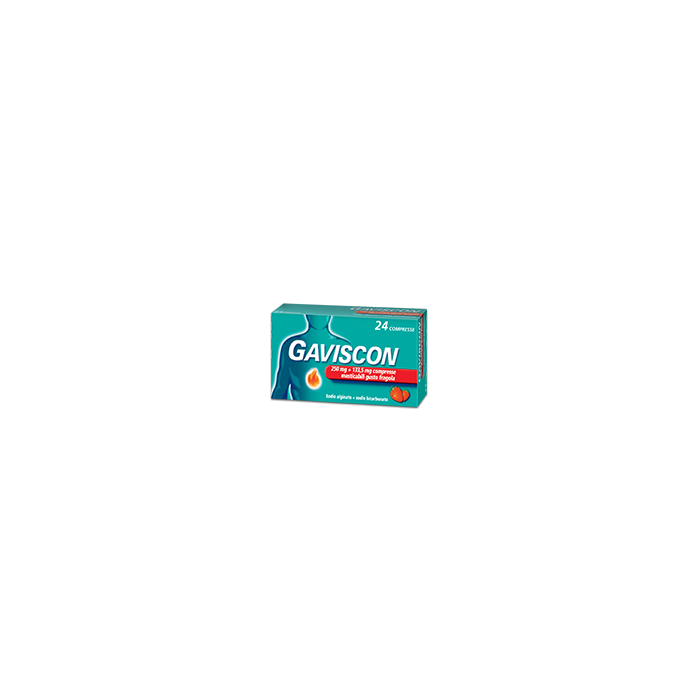Gaviscon 500 mg + 267 mg compresse masticabili gusto menta. Una compressa contiene: Principi attivi: sodio alginato 500 mg; sodio bicarbonato 267 mg. Eccipiente con effetti noti: aspartame 7,5 mg sodio 126,5 mg Gaviscon 250 mg + 133,5 mg compresse masticabili gusto menta. Una compressa contiene: Principi attivi: sodio alginato 250 mg; sodio bicarbonato 133,5 mg. Eccipiente con effetti noti: aspartame 3,75 mg sodio 63,25 mg Gaviscon 250 mg + 133,5 mg compresse masticabili gusto fragola. Una compressa contiene: Principi attivi: sodio alginato 250 mg, sodio bicarbonato 133,5 mg. Eccipiente con effetti noti: aspartame 8,80 mg sodio 63,25 mg Gaviscon 500 mg/10 ml + 267 mg/10 ml sospensione orale . 10 ml contengono: Principi attivi: sodio alginato 500 mg; sodio bicarbonato 267 mg. Eccipienti con effetti noti: metile paraidrossibenzoato 40 mg propile paraidrossibenzoato 6 mg alcol benzilico 1,1 mg sodio 142,6 mg Gaviscon 500 mg/10 ml + 267 mg/10 ml sospensione orale aroma menta. 10 ml contengono: Principi attivi: sodio alginato 500 mg; sodio bicarbonato 267 mg. Eccipienti con effetti noti: metile paraidrossibenzoato 40 mg propile paraidrossibenzoato 6 mg sodio 142,6 mg Per l’elenco completo degli eccipienti, vedere paragrafo 6.1.