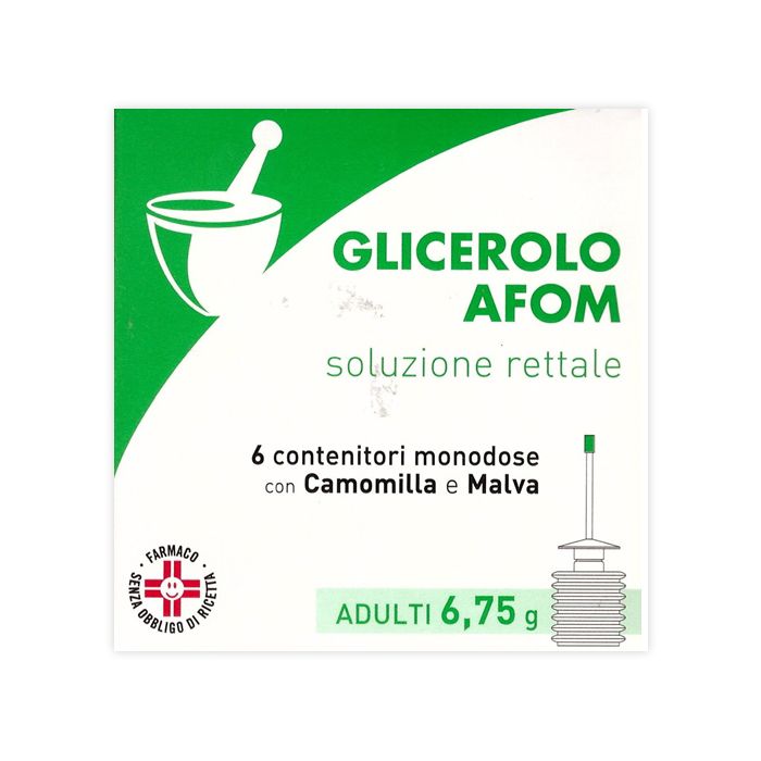 GLICEROLO AFOM prima infanzia 2,25 g soluzione rettale - 6 contenitori monodose con camomilla e malva. Ogni contenitore monodose contiene: principi attivi: Glicerolo 2,25 g. GLICEROLO AFOM bambini 4,5 g soluzione rettale - 6 contenitori monodose con camomilla e malva. Ogni contenitore monodose contiene: principi attivi: Glicerolo 4,5 g. GLICEROLO AFOM adulti 6,75 g soluzione rettale - 6 contenitori monodose con camomilla e malva. Ogni contenitore monodose contiene: principi attivi: Glicerolo 6,75 g. Per l’elenco completo degli eccipienti vedere paragrafo 6.1.
