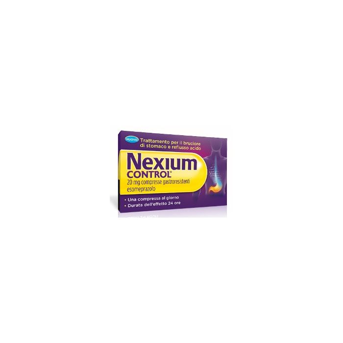 Posologia La dose raccomandata è di 20 mg di esomeprazolo (una compressa) al giorno. Potrebbe essere necessario assumere le compresse per 2-3 giorni consecutivi per ottenere il miglioramento dei sintomi. La durata del trattamento è fino a 2 settimane. Una volta ottenuta la completa scomparsa dei sintomi, il trattamento deve essere interrotto. Se non si ottiene la risoluzione dei sintomi entro 2 settimane di trattamento continuo, il paziente deve consultare un medico. Popolazioni particolari Pazienti con compromissione renale Non è necessario un aggiustamento della dose nei pazienti con funzione renale compromessa. Data la limitata esperienza in pazienti con grave insufficienza renale, tali pazienti devono essere trattati con cautela (vedere paragrafo 5.2). Pazienti con compromissione epatica Non è necessario un aggiustamento della dose nei pazienti con compromissione epatica lieve o moderata. Tuttavia, i pazienti con compromissione epatica grave devono essere consigliati da un medico prima di assumere Nexium Control (vedere paragrafo 4.4 e 5.2). Pazienti anziani (≥65 anni) Non è necessario un aggiustamento della dose nei pazienti anziani. Popolazione pediatrica Non esiste alcuna indicazione per un uso specifico di Nexium Control nella popolazione pediatrica di età inferiore a 18 anni per l’indicazione “trattamento a breve termine dei sintomi da reflusso (es. pirosi e rigurgito acido)”. Modo di somministrazione Le compresse devono essere deglutite intere con mezzo bicchiere di acqua. Le compresse non devono essere masticate o frantumate.In alternativa la compressa può essere dispersa in mezzo bicchiere di acqua non gassata. Non devono essere usati altri liquidi in quanto il rivestimento gastroresistente si potrebbe dissolvere. L’acqua deve essere mescolata fino a disperdere la compressa. Il liquido con i granuli deve essere bevuto immediatamente o entro 30 minuti. Il bicchiere deve essere sciacquato con mezzo bicchiere di acqua e l’acqua bevuta. I granuli non devono essere masticati o frantumati.