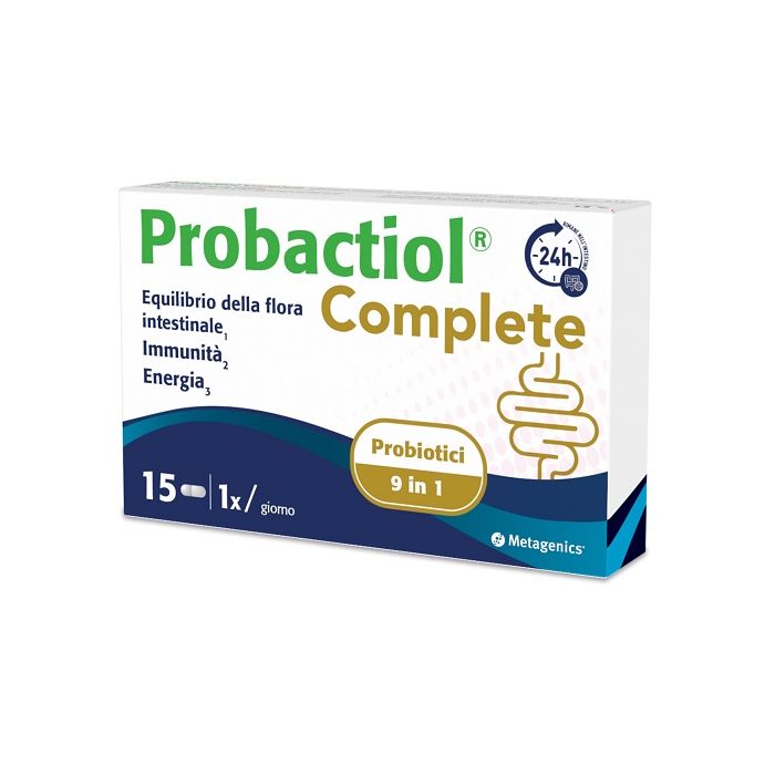 Contiene 9 ceppi probiotici in un’unica capsula, con una combinazione di 28 miliardi di batteri vivi e vitali, vitamina D per sostenere la normale funzione del sistema immunitario e vitamina B2 che contribuisce al mantenimento di membrane e mucose normali, come quelle dell’intestino. Inoltre, Probactiol Complete contiene vitamine B1 e B2 che contribuiscono al normale metabolismo energetico.