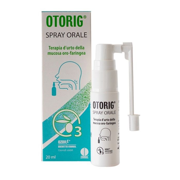 Dispositivo medico specifico per la prevenzione e il trattamento delle affezioni della mucosa oro-faringea sia in fase acuta che cronica. Crea un film lipidico protettivo contro aggressioni esterne e fattori ambientali avversi generando un ambiente ostile alle alterazioni del microbiota. Otorig spray orale è indicato in tutte quelle situazioni a carico di bocca, gengive, gola, caratterizzate da forte irritazione, gonfiore, bruciore, prurito, difficoltà nella deglutizione, stress ossidativo di varia eziologia, coadiuvante in caso di raucedine e tosse di varia natura, sindromi influenzali o da raffreddamento, postumi operatori in ORL. Formulazione innovativa con Ozoile, Otorig spray orale crea una barriera protettiva che dona sollievo immediato, preserva il microbiota e ripristina il buono stato delle mucose del cavo orale.