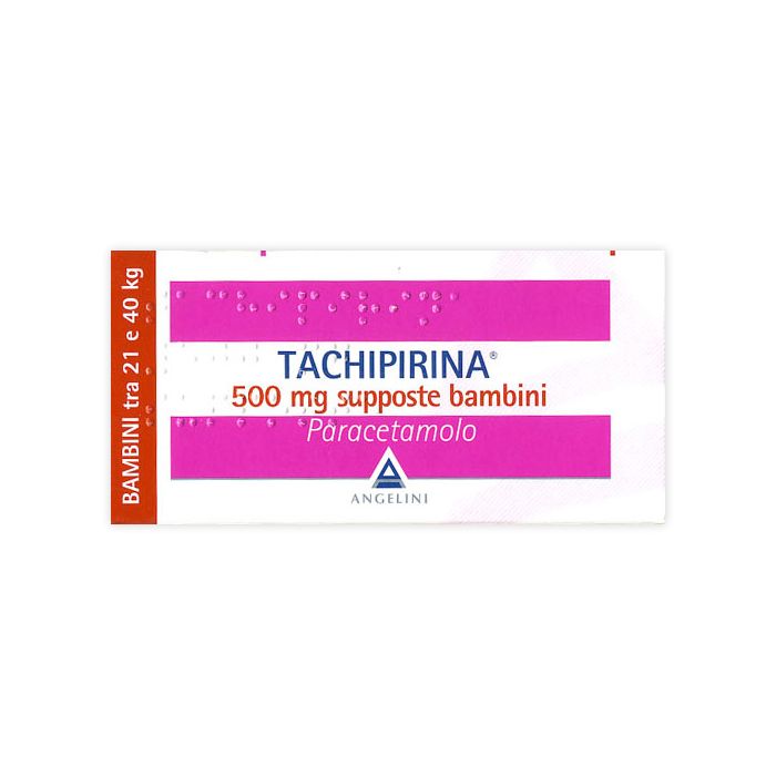 Per i bambini è indispensabile rispettare la posologia definita in funzione del loro peso corporeo, e quindi scegliere la formulazione adatta. Le età approssimate in funzione del peso corporeo sono indicate a titolo d’informazione. Negli adulti la posologia massima per via orale è di 3000 mg e per via rettale è di 4000 mg di paracetamolo al giorno (vedere par. 4.9). Il medico deve valutare la necessità di trattamenti per oltre 3 giorni consecutivi. Lo schema posologico di Tachipirina in rapporto al peso corporeo ed alla via di somministrazione è il seguente: Compresse da 500 mg.Bambini di peso compreso tra 21 e 25 kg (approssimativamente tra i 6,5 ed inferiore a 8 anni): ½ compressa alla volta, da ripetere se necessario dopo 4 ore, senza superare le 6 somministrazioni al giorno (3 compresse). • Bambini di peso compreso tra 26 e 40 kg (approssimativamente tra gli 8 egli 11 anni): 1 compressa alla volta, da ripetere se necessario dopo 6 ore, senza superare le 4 somministrazioni al giorno. • Ragazzi di peso compreso tra 41 e 50 kg (approssimativamente tra i 12 ed i 15 anni): 1 compressa alla volta, da ripetere se necessario dopo 4 ore, senza superare le 6 somministrazioni al giorno. • Ragazzi di peso superiore a 50 kg (approssimativamente sopra i 15 anni): 1 compressa alla volta, da ripetere se necessario dopo 4 ore, senza superare le 6 somministrazioni al giorno. • Adulti: 1 compressa alla volta, da ripetere se necessario dopo 4 ore, senza superare le 6 somministrazioni al giorno. Nel caso di forti dolori o febbre alta, 2 compresse da 500 mg da ripetere se necessario dopo non meno di 4 ore. Granulato effervescente da 500 mg in bustine. Sciogliere il granulato effervescente in un bicchiere d’acqua. • Bambini di peso compreso tra 26 e 40 kg (approssimativamente tra gli 8 e gli 11 anni): 1 bustina alla volta, da ripetere se necessario dopo 6 ore, senza superare le 4 somministrazioni al giorno. • Ragazzi di peso compreso tra 41 e 50 kg (approssimativamente tra i 12 ed i 15 anni): 1 bustina alla volta, da ripetere se necessario dopo 4 ore, senza superare le 6 somministrazioni al giorno. • Ragazzi di peso superiore a 50 kg (approssimativamente sopra i 15 anni): 1 bustina alla volta, da ripetere se necessario dopo 4 ore, senza superare le 6 somministrazioni al giorno. • Adulti: 1 bustina alla volta, da ripetere se necessario dopo 4 ore, senza superare le 6 somministrazioni al giorno. Nel caso di forti dolori o febbre alta, 2 bustine da 500 mg da ripetere se necessario dopo non meno di 4 ore. Granulato effervescente da 125 mg in bustine. Sciogliere il granulato effervescente in un bicchiere d’acqua. • Bambini di peso compreso tra 7 e 10 kg (approssimativamente tra i 6 ed i 19 mesi): 1 bustina alla volta, da ripetere se necessario dopo 6 ore, senza superare le 4 somministrazioni al giorno. • Bambini di peso compreso tra 11 e 12 kg (approssimativamente tra i 20 ed i 29 mesi): 1 bustina alla volta, da ripetere se necessario dopo 4 ore, senza superare le 6 somministrazioni al giorno. • Bambini di peso compreso tra 13 e 20 kg (approssimativamente tra i 30 mesi ed inferiore a 6,5 anni): 2 bustine alla volta (corrispondenti a 250 mg di paracetamolo), da ripetere se necessario dopo 6 ore, senza superare le 4 somministrazioni al giorno. • Bambini di peso compreso tra 21 e 25 kg (approssimativamente tra i 6,5 ed inferiore a 8 anni): 2 bustine alla volta (corrispondenti a 250 mg di paracetamolo), da ripetere se necessario dopo 4 ore, senza superare le 6 somministrazioni al giorno. Supposte Neonati da 62,5 mg.Bambini di peso compreso tra 3,2 e 5 kg (approssimativamente tra la nascita ed i 2 mesi): 1 supposta alla volta, da ripetere se necessario dopo 6 ore, senza superare le 4 somministrazioni al giorno. Supposte Prima Infanzia da 125 mg. Bambini di peso compreso tra 6 e 7 kg (approssimativamente tra i 3 ed i 5 mesi): 1 supposta alla volta, da ripetere se necessario dopo 6 ore, senza superare le 4 somministrazioni al giorno. • Bambini di peso compreso tra 7 e 10 kg (approssimativamente tra i 6 ed i 19 mesi): 1 supposta alla volta, da ripetere se necessario dopo 4 - 6 ore, senza superare le 5 somministrazioni al giorno. • Bambini di peso compreso tra 11 e 12 kg (approssimativamente tra i 20 ed i 29 mesi): 1 supposta alla volta, da ripetere se necessario dopo 4 ore, senza superare le 6 somministrazioni al giorno. Supposte Bambini da 250 mg.Bambini di peso compreso tra 11 e 12 kg (approssimativamente tra i 20 ed i 29 mesi): 1 supposta alla volta, da ripetere se necessario dopo 8 ore, senza superare le 3 somministrazioni al giorno. • Bambini di peso compreso tra 13 e 20 kg (approssimativamente tra i 30 mesi ed inferiore a 6,5 anni): 1 supposta alla volta, da ripetere se necessario dopo 6 ore, senza superare le 4 somministrazioni al giorno. Supposte Bambini da 500 mg.Bambini di peso compreso tra 21 e 25 kg (approssimativamente tra i 6,5 ed inferiore a 8 anni): 1 supposta alla volta, da ripetere se necessario dopo 8 ore, senza superare le 3 somministrazioni al giorno. • Bambini di peso compreso tra 26 e 40 kg (approssimativamente tra gli 8 e gli 11 anni): 1 supposta alla volta, da ripetere se necessario dopo 6 ore, senza superare le 4 somministrazioni al giorno. Supposte Adulti da 1000 mg.Ragazzi di peso compreso tra 41 e 50 kg (approssimativamente tra i 12 ed i 15 anni): 1 supposta alla volta, da ripetere se necessario dopo 8 ore, senza superare le 3 somministrazioni al giorno. • Ragazzi di peso superiore a 50 kg (approssimativamente sopra i 15 anni): 1 supposta alla volta, da ripetere se necessario dopo 6 ore, senza superare le 4 somministrazioni al giorno. • Adulti: 1 supposta alla volta, da ripetere se necessario dopo 6 ore, senza superare le 4 somministrazioni al giorno. Insufficienza renale. In caso di insufficienza renale grave (clearance della creatinina inferiore a 10 ml/min), l’intervallo tra le somministrazioni deve essere di almeno 8 ore.