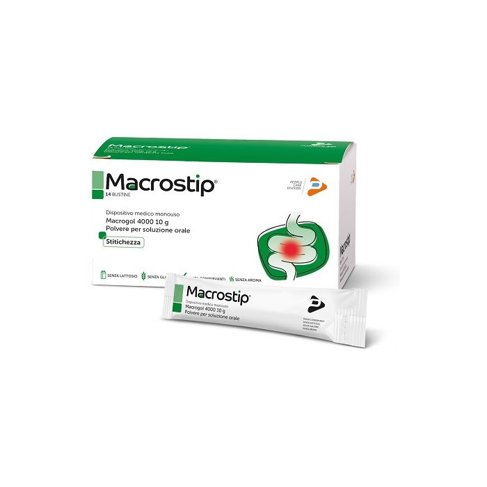 Prodotto ad azione lassativa che, grazie al meccanismo osmotico, regolarizza le funzioni intestinali. Non viene assorbito, né fermenta nell'intestino, non irrita la mucosa e viene eliminato nelle feci in forma non modificata. Grazie infatti alla sua affinità per l'acqua Macrostip bustine ammorbidisce le feci facilitando l'evacuazione. La sua azione non si riduce nel tempo.