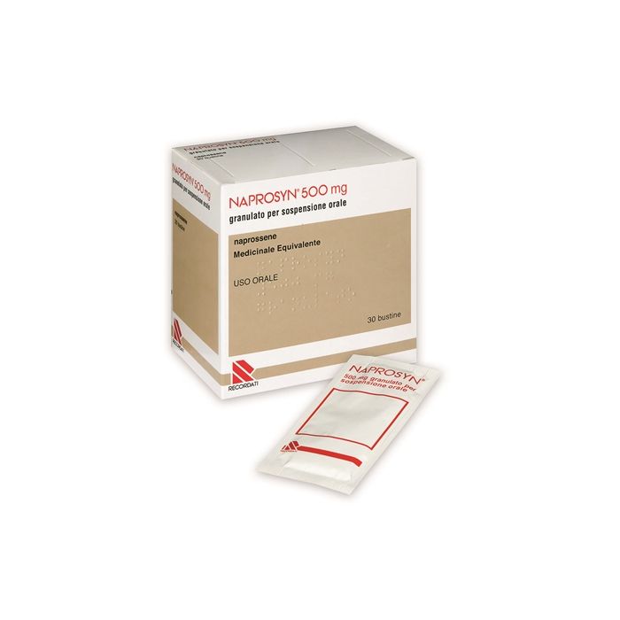 Naprosyn 250 mg compresse gastroresistenti. Ogni compressa gastroresistente contiene 250 mg di naprossene Eccipiente con effetti noti: Ogni compressa gastroresistente contiene 1,14 mg di sodio. Naprosyn 500 mg compresse gastroresistenti. Ogni compressa gastroresistente contiene 500 mg di naprossene Eccipiente con effetti noti: Ogni compressa gastroresistente contiene 2,29 mg di sodio. Naprosyn 500 mg supposte. Ogni supposta contiene 500 mg di naprossene. Naprosyn 500 mg granulato per sospensione orale. Ogni bustina contiene 500 mg di naprossene. Eccipiente con effetti noti: Ogni bustina contiene 1,65 g di saccarosio e 3,92 mg di sodio. Naprosyn 250 mg granulato per sospensione orale. Ogni bustina contiene 250 mg di naprossene. Eccipienti con effetti noti: Ogni bustina contiene 1,56 g di saccarosio e 18,24 mg di sodio. Naprosyn 750 mg compresse a rilascio modificato. Ogni compressa a rilascio modificato contiene 750 mg di naprossene. Eccipiente con effetti noti: ogni compressa a rilascio modificato contiene 0,64 mg di giallo tramonto (E110). Per l’elenco completo degli eccipienti, vedere paragrafo 6.1.