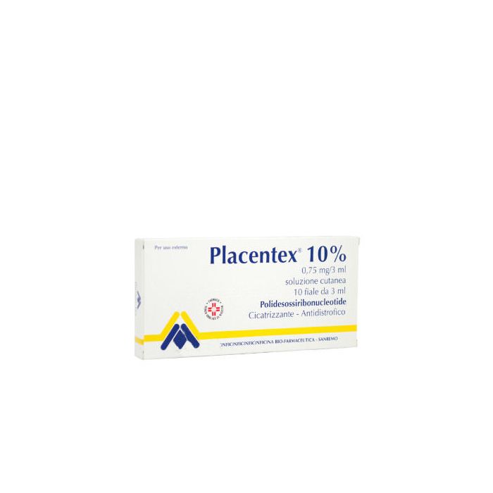 Forme Farmaceutiche per uso parenterale: PLACENTEX "5.625 mg/3 ml soluzione iniettabile" 1 fiala da 3 ml contiene: Principio Attivo: Polidesossiribonucleotide mg 5,625 PLACENTEX "2.25 mg/3 ml soluzione iniettabile" 1 fiala da 3 ml contiene: Principio Attivo: Polidesossiribonucleotide mg 2,25. Forme Farmaceutiche per uso esterno: PLACENTEX "0.08 % crema" tubo da 25 g contiene: Principio Attivo: Polidesossiribonucleotide mg 80 PLACENTEX "0.75 mg/3 ml soluzione cutanea" 1 fiala da 3 ml contiene: Principio Attivo: Polidesossiribonucleotide mg 0,75 PLACENTEX "0.75 mg/ml collirio" un flacone contagocce da 10 ml contiene: Principio Attivo: Polidesossiribonucleotide mg 7,5