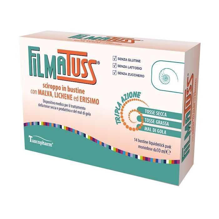 Filmatuss sciroppo in bustine, grazie ai suoi componenti malva, lichene ed erisimo, forma un film protettivo e lenitivo persistente ad effetto barriera. Contribuisce pertanto a proteggere la mucosa orofaringea dall’attacco di agenti patogeni e dagli stimoli nocivi ambientali; reidrata rapidamente la mucosa orofaringea risultando utile nei casi di: tosse, raucedine, difficoltà della deglutizione, orofaringiti, mal di gola, raffreddore, gola infiammata.