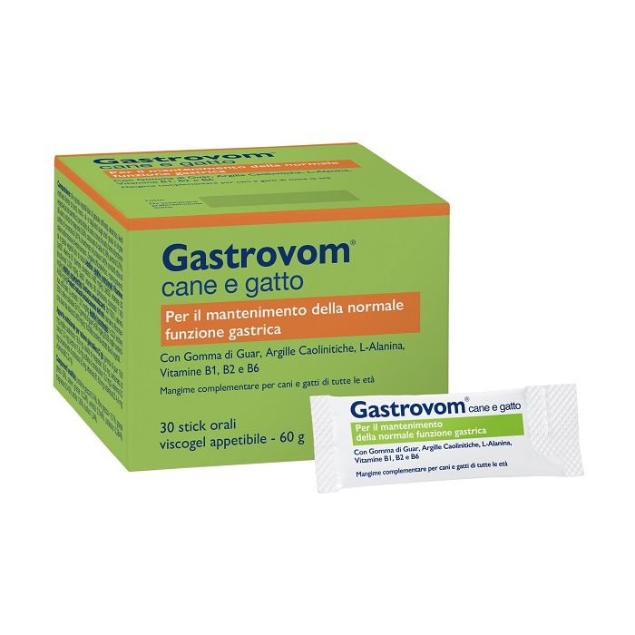 Mangime complementare in forma di gel fluido appetibile dalla consistenza viscoadesiva. La sua particolare formulazione contribuisce al normale funzionamento del tratto gastroesofageo ed al mantenimento delle normali condizioni di acidit? dello stomaco, favorendo la normale funzionalit? della mucosa gastrica. L'utilizzo di Gastrovom viscogel ? indicato anche in caso di nausea e cinetosi nel cane e nel gatto.