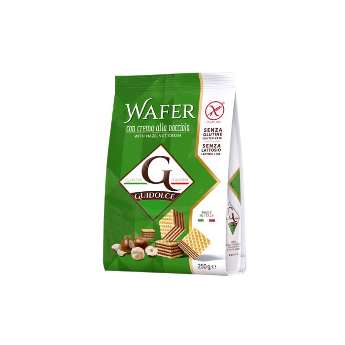 Wafers farciti con crema alla nocciola (crema 75%) senza glutine. 3 cialde di wafer con 2 strati di farcitura alla nocciola. Il prodotto è formulato specificatamente per consumatori celiaci ed è privo di lattosio; non ci sono comunque prescrizioni al consumo da parte del consumatore non sensibile.