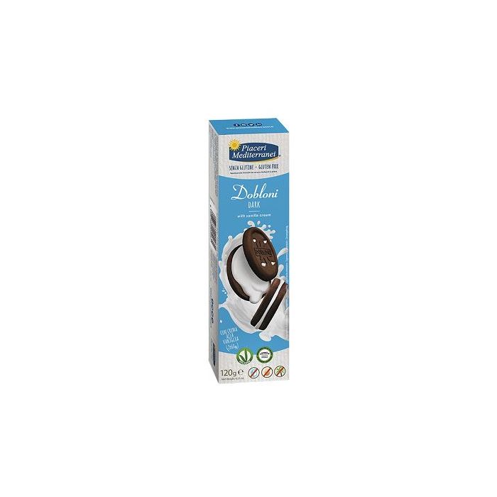 Biscotti senza glutine, con crema alla vaniglia tra due friabili biscotti al cacao.