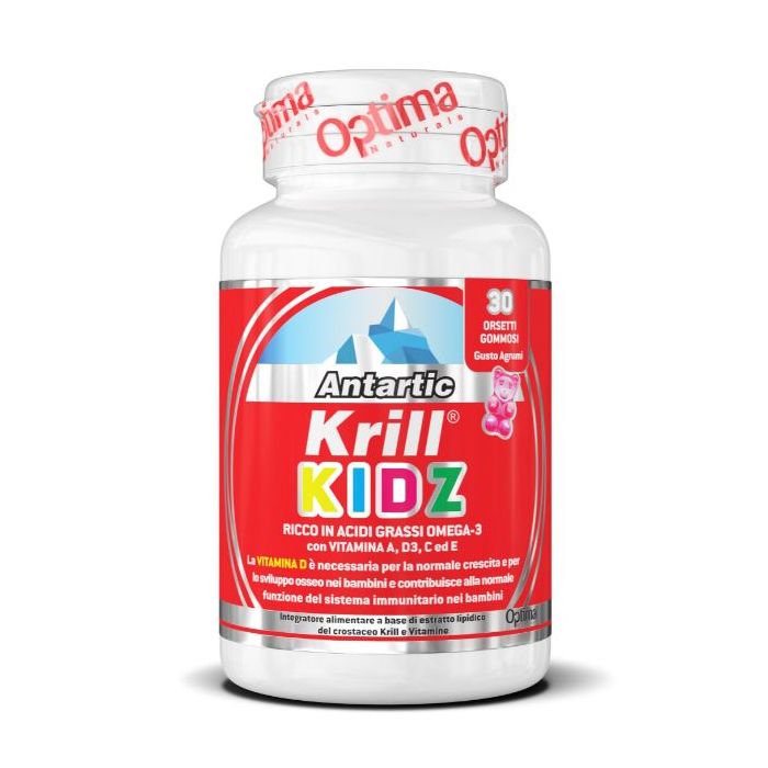 Integratore alimentare in forma di orsetti gommosi con estratto lipidico del crostaceo Krill antartico (Euphasia superba), vitamine A, D3, C ed E. Ricco in acidi grassi Omega-3. La vitamina D è necessaria per la normale crescita e per lo sviluppo osseo nei bambini e contribuisce alla normale funzione del sistema immunitario nei bambini.