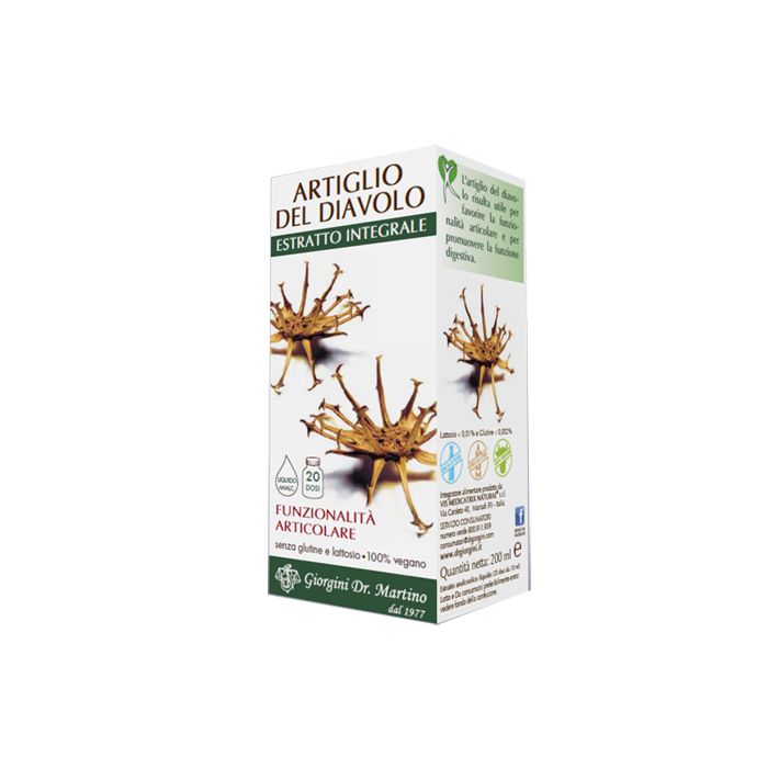Integratore alimentare a base di estratto vegetale di artiglio del diavolo. L'artiglio del diavolo risulta utile per favorire la funzionalità articolare e per promuovere la funzione digestiva. L'estratto integrale del Dr. Giorgini consiste in un estratto concentrato contenente l'intero fitocomplesso della pianta. L'efficacia e la qualità del prodotto sono garantite dall'estrazione sottovuoto e a bassa temperatura che permette di preservare integri tutti i principi attivi e nutritivi della pianta (fitocomplesso). L'eventuale presenza di resine e oli essenziali in superficie e/o di sedimento sul fondo del prodotto sono garanzia di qualità. Infatti essi costituiscono le frazioni insolubili del fitocomplesso. Per questo motivo si raccomanda di agitare ogni volta prima dell'uso. 100% vegano.