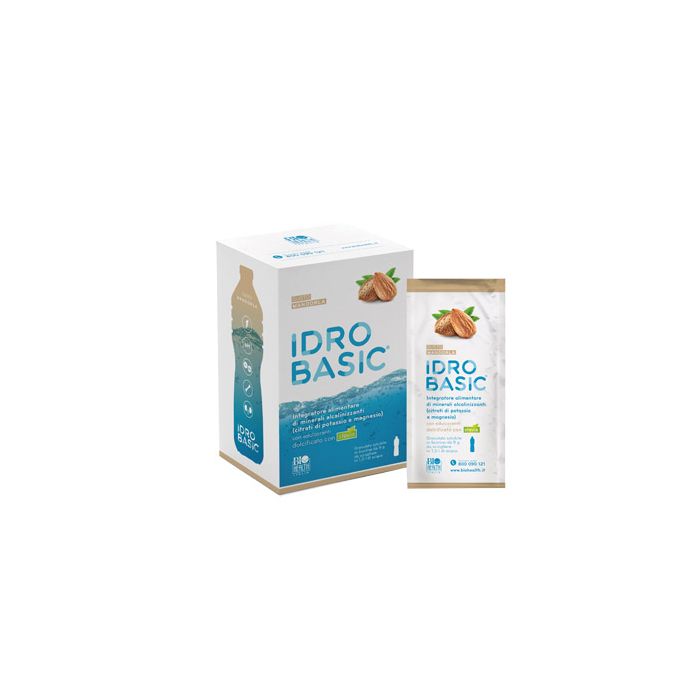 Integratore alimentare di minerali alcalinizzanti (citrati di potassio e magnesio), dolcificato con stevia. Ideale nel gestire e prevenire alcune patologie collegate alla disidratazione, e favorire una situazione di benessere derivante da un corretto equilibrio idrico dell'organismo. L'idropinoterapia è particolarmente importante in taluni soggetti sottoposti a forte disidratazione o ad aumentati fabbisogni: donne in gravidanza, atleti e sportivi in genere, bambini, anziani, pazienti affetti da calcoli renali, osteoporosi, dissenteria o in terapia con diuretici, lassativi e cortisonici. Idrobasic inoltre, apporta la giusta quantità di potassio e magnesio, al normale metabolismo energetico e alla normale funzione muscolare e ossea. Il tutto è stato realizzato utilizzando una miscela a bassissimo contenuto calorico (massimo 25 kcal per ogni bustina). Idrobasic ha una natura alcalina, infatti, essendo a base di citrato, è anche utile ad integrare una dieta povera di valenze alcaline (frutta e verdura) o compensare una dieta con elevato apporto di proteine o grassi che determinerebbero un eccessivo carico acido per l'organismo.