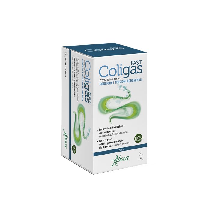 Integratore alimentare utile in caso di gonfiore addominale spesso associato a fastidiose tensioni che possono essere avvertite subito dopo i pasti o durante la giornata. L'esclusiva formulazione si contraddistingue per la sinergia di coriandolo, zenzero e finocchio che sono utili per favorire l'eliminazione dei gas intestinali. Inoltre lo zenzero unito al cumino e la menta supportano la regolare motilità gastrointestinale e coadiuvano la digestione. ColiGas Fast tisana, è particolarmente gradevole anche senza l'aggiunta di zucchero, grazie alla presenza dell'olio essenziale di finocchio. ColiGas Fast è un integratore alimentare naturale e biodegradabile al 100%, non contiene sostanze di sintesi, emi- sintesi o geneticamente modificate.