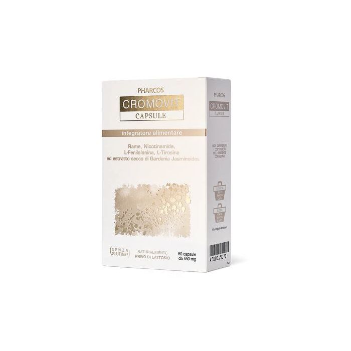 Integratore alimentare di Acido para-aminobenzoico, Selenio, Coenzima Q10, Rame, Nicotinammide, Acido folico, Vitamina E e Vitamina B12, con L-Acetilcisteina, L -Fenilalanina, L-Tirosina e Alga klamath, utile a colmare le carenze nutrizionali o gli aumentati fabbisogni di tali nutrienti. Grazie anche alla presenza del Rame, il prodotto contribuisce alla normale pigmentazione della pelle. Il Selenio, il Rame e la Vitamina E contribuiscono alla protezione delle cellule dallo stress ossidativo, mentre la Nicotinammide contribuisce al mantenimento di una pelle normale. In base alle dichiarazioni allergeni degli ingredienti, Cromovit Capsule non contiene nessuno degli altri allergeni secondo la normativa vigente (Allegato III bis Direttiva 2007/68/CE).