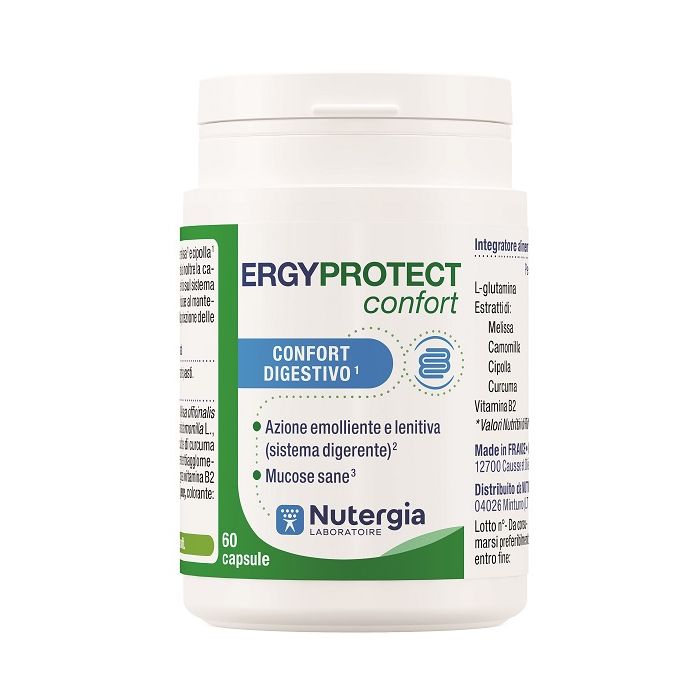 L-glutamina; estratti di: melissa (Melissa officinalis L., foglie), camomilla (Matricaria chamomilla L., fiore), cipolla (Allium cepa L., bulbo), curcuma (Curcuma Longa L., rizoma), carrubo (Ceratonia siliqua L., frutto); agente antiagglomerante: magnesio stearato vegetale; vitamina B2 (riboflavina); capsula: gelatina di pesce; colorante: ossido di ferro.