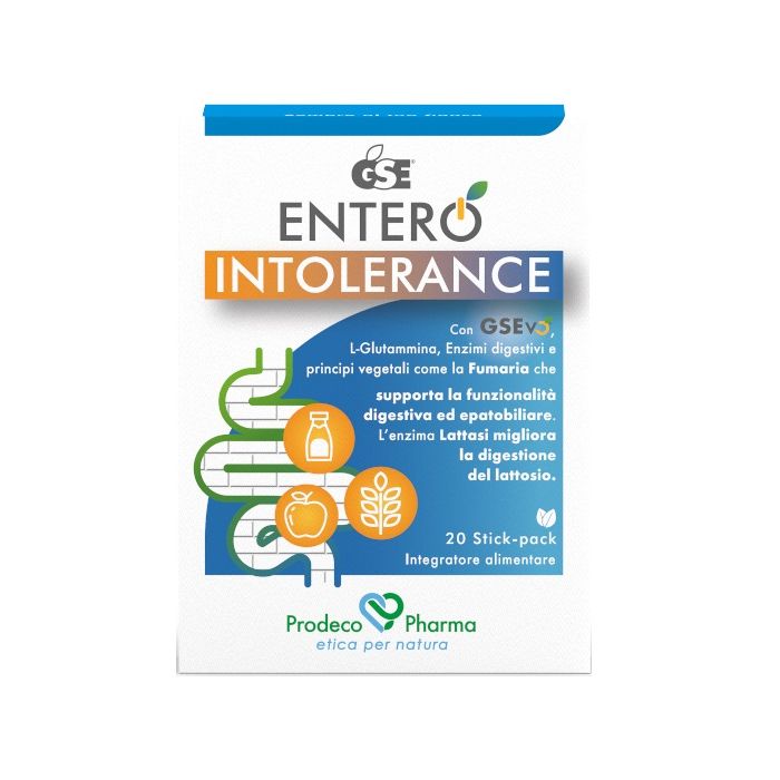 L-glutammina, lime [Citrus aurantiifolia (Christm.) Swingle] frutto polvere; GSEvo: pompelmo (Citrus paradisi Macfad.) semi e.s. ed estratto liofilizzato; melograno (Punica granatum L.) frutto succo disidratato, maltodestrine, prolilendopeptidasi 580.000 PPI/g, complesso enzimatico da substrati vegetali fermentati, perilla [Perilla frutescens (L.) Britton] foglie e.s. tit. 10% polifenoli, fumaria (Fumaria officinalis L.) parti aeree con fiori e.s. tit. 0,04% protropina, vitamina C (acido ascorbico), lattasi (beta-galattosidasi) 100.000 ALU/g, bromelina [da ananas (Ananas comosus L. Merr.) Stipiti] 2500 GDU/g, alfa-galattosidasi 30000 GalU/g, vitamina B6 (piridossina cloridrato).