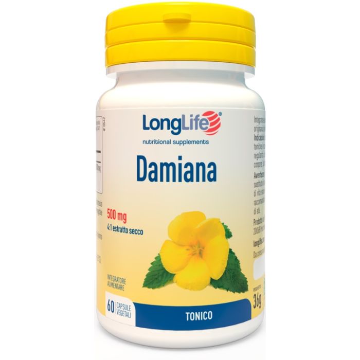 Integratore alimentare a base di damiana. La damiana è un arbusto originario del Messico e dell'America Centrale e Meridionale, tradizionalmente utilizzato per le sue capacità toniche, in caso di stanchezza fisica e mentale, per favorire la regolarità del transito intestinale, il drenaggio dei liquidi corporei, la funzionalità digestiva e delle vie urinarie.