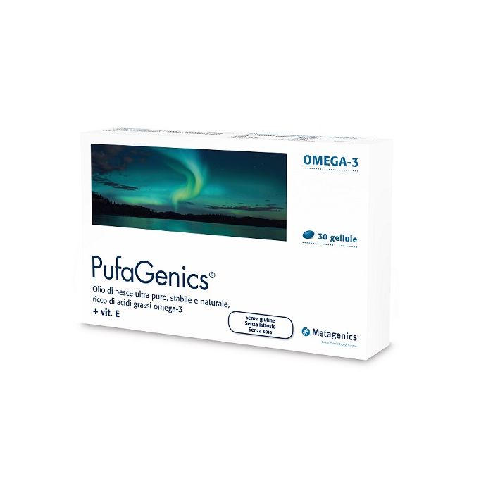 Integratore alimentare di acidi grassi omega-3 con vitamina E. PufaGenics è un olio di pesce ultra puro, con le stesse caratteristiche di composizione naturale del pesce. Certificato e contrassegnato dall’ecolabel Friend of the Sea. La pesca non ha alcun impatto negativo sull’ambiente e vengono rispettati criteri di sostenibilità e contiene oli ultra stabili. Grazie a un processo innovativo viene efficacemente tenuta sotto controllo l’ossidazione. La tecnologia garantisce il mantenimento a livelli ottimali delle qualità nutrizionali e organolettiche degli oli. Apporta in particolare DHA ed EPA, due acidi grassi polinsaturi omega-3 che contribuiscono al buon funzionamento dell’apparato cardiovascolare, agendo favorevolmente su circolazione e pressione sanguigna, e al mantenimento delle normali funzioni cognitive.