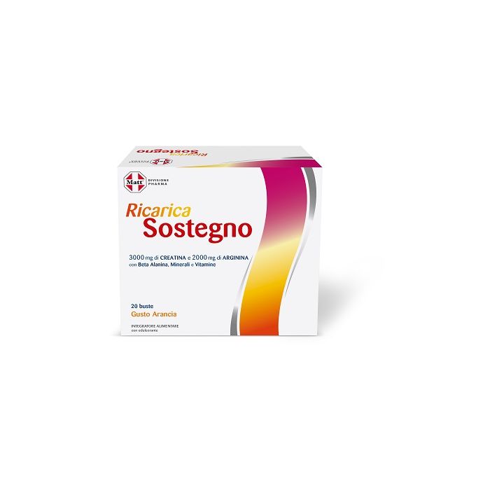 Durante i cambi di stagione, quando si è esausti e non si ha più energia, nei momenti intensi di studio o di attività sportiva, nei periodi di stress, in stati di convalescenza, può essere utile integrare la nostra alimentazione con l’apporto di specifici nutrienti per darci la giusta carica. Ricarica Sostegno è un integratore alimentare a base di creatina, arginina, beta alanina, minerali e vitamine. La vitamina C, il ferro e il magnesio contribuiscono alla riduzione della stanchezza e dell’affaticamento. La vitamina C, il ferro e lo zinco contribuiscono alla normale funzione del sistema immunitario. La vitamina C, la vitamina B1, il magnesio e il ferro contribuiscono al normale metabolismo energetico.
