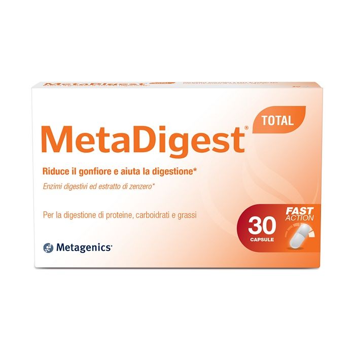 Integratore di enzimi per favorire la digestione di proteine, carboidrati e grassi. MetaDigest Total è un integratore a base di enzimi digestivi di origine non animale e quindi adatto anche a consumatori vegetariani o vegani. Esso contiene una miscela bilanciata di enzimi per la digestione delle proteine, dei grassi e dei carboidrati normalmente presenti in un pasto completo. La presenza di lecitina aiuta ad emulsionare i grassi e la presenza di fitasi favorisce la degradazione dei fitati presenti in una dieta ricca di vegetali che possono contrastare l'assorbimento di alcuni micronutienti. Gli enzimi di MetaDigest total funzionano indipendentemente dal pH e quindi già nello stomaco. La formulazione di MetaDigest total contiene anche estratto secco di zenzero in grado di supportare la funzione digestiva.