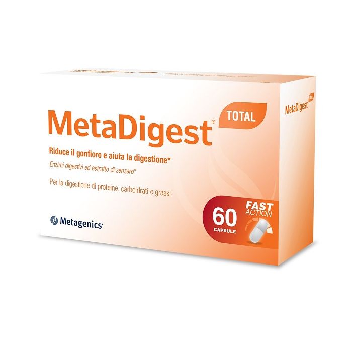 Integratore di enzimi per favorire la digestione di proteine, carboidrati e grassi. MetaDigest Total è un integratore a base di enzimi digestivi di origine non animale e quindi adatto anche a consumatori vegetariani o vegani. Esso contiene una miscela bilanciata di enzimi per la digestione delle proteine, dei grassi e dei carboidrati normalmente presenti in un pasto completo. La presenza di lecitina aiuta ad emulsionare i grassi e la presenza di fitasi favorisce la degradazione dei fitati presenti in una dieta ricca di vegetali che possono contrastare l'assorbimento di alcuni micronutienti. Gli enzimi di MetaDigest total funzionano indipendentemente dal pH e quindi già nello stomaco. La formulazione di MetaDigest total contiene anche estratto secco di zenzero in grado di supportare la funzione digestiva.