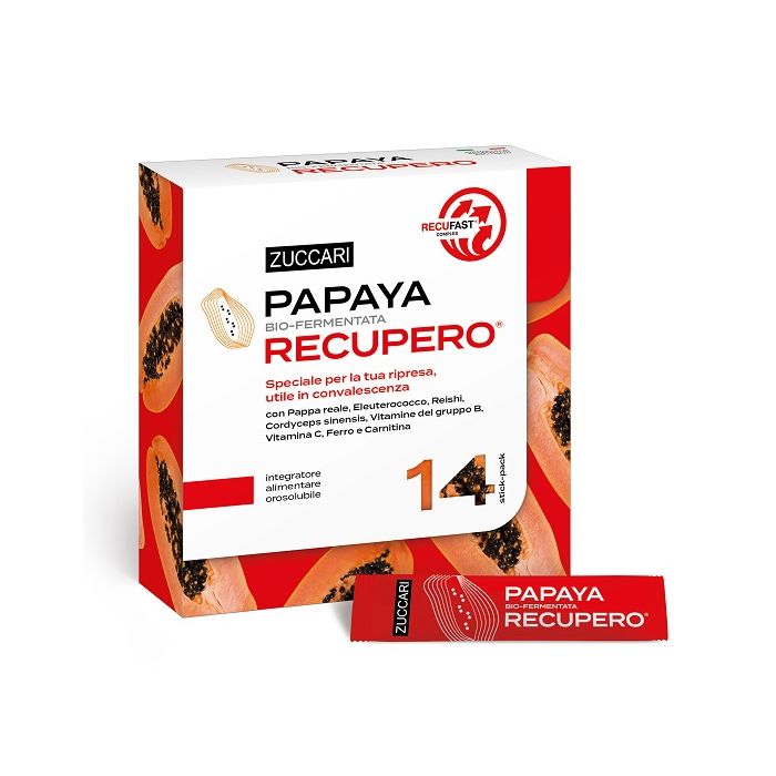 integratore alimentare a base di polpa di Carica papaya biofermentata, atomizzata e granulata con naturali proprietà antiossidanti. Papaya Recupero è ideale nei periodi di debolezza, spossatezza e quindi utile anche nei periodi di convalescenza. La papaya bio-fermentata zuccari è resa speciale da Recufast Complex, un mix di attivi per un pronto e pieno recupero: eleuterococco tonico-adattogeno, cordyceps sinensis per l'azione tonica e di sostegno metabolico, ferro e vitamine del gruppo B per ridurre stanchezza e affaticamento oltre a vitamina C che contribuisce al normale metabolismo energetico e accresce l'assorbimento del ferro. L'esclusivo mix è reso completo da pappa reale, reishi e carnitina.