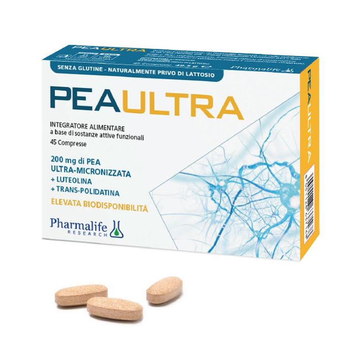Integratore alimentare a base di PEA (palmitoiletanolamide) ultra-micronizzata ad elevata biodisponibilità. La sua forma ultra-micronizzata e la presenza di luteolina e trans-polidatina ne aumentano la biodisponibilità.