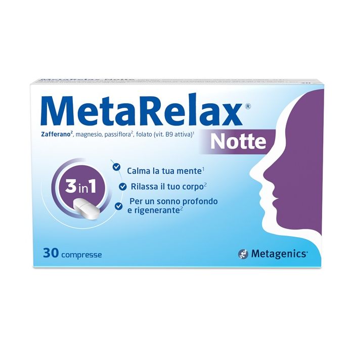 Formulazione completa a base di magnesio e una miscela sinergica di estratti vegetali studiata per fornire un supporto mirato nel calmare i pensieri e favorire il rilassamento durante la notte. La passiflora e lo zafferano sono clinicamente provati per favorire il rilassamento di mente e corpo, facilitando l’addormentamento. Inoltre, MetaRelax Notte contiene glicerofosfato e bisglicinato di magnesio, zinco e vitamine B attive (L-metilfolato/vitamina B9, metilcobalamina/vitamina B12 e piridossal-5-fosfato/vitamina B6). Il folato contribuisce alla normale funzione psicologica, soprattutto in situazioni di stress.