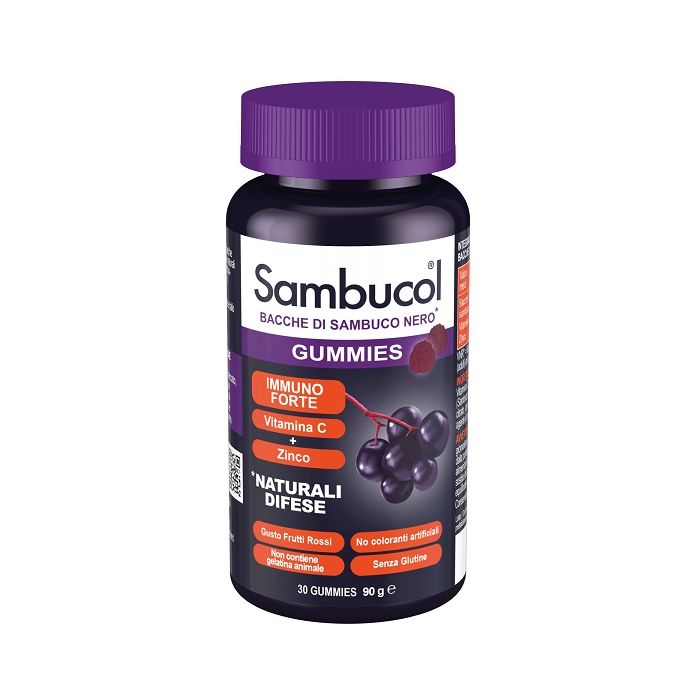 Sambucol Immuno Forte - Gummies contiene bacche di sambuco nero che contribuiscono a mantenere le naturali difese dell’organismo e vitamina C e zinco che contribuiscono alla normale funzione del sistema immunitario.