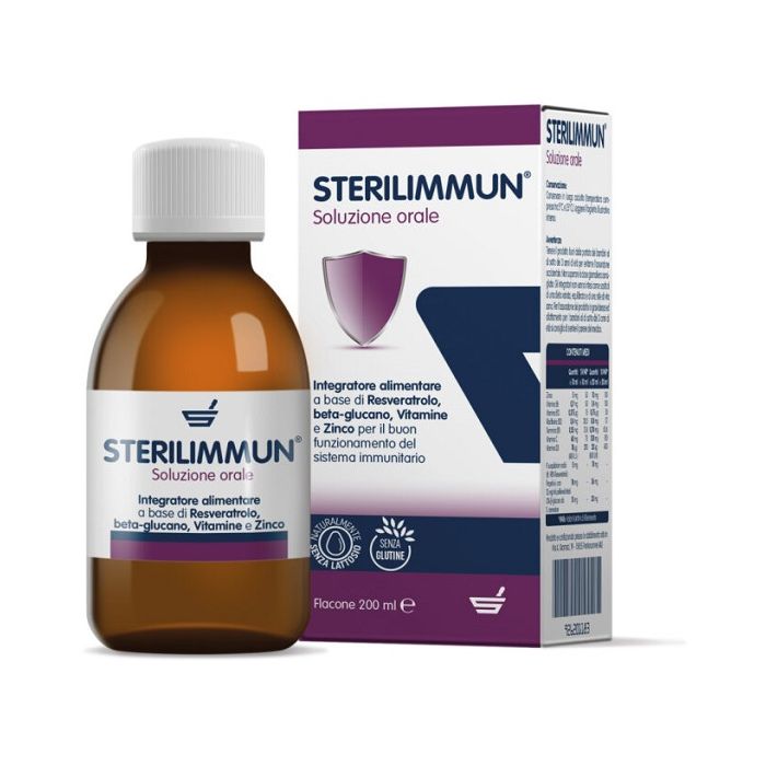 Sterilimmun è un integratore alimentare a base di betaglucano da s. cerevisiae, resveratrolo, estratto da propoli, zinco, vitamine del gruppo B, vitamina C, vitamina D.