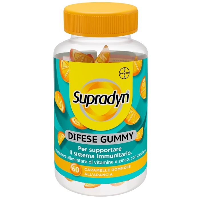 DescrizioneIntegratore di vitamine e zinco specificamente formulato nei casi di ridotto apporto di vitamine con la normale dieta o di un aumentato fabbisogno fisiologico. Supradyn Difese Gummy è in caramelle gommose. Un nuovo modo di assumere le vitamine senza rinunciare al piacevole gusto di una caramella.