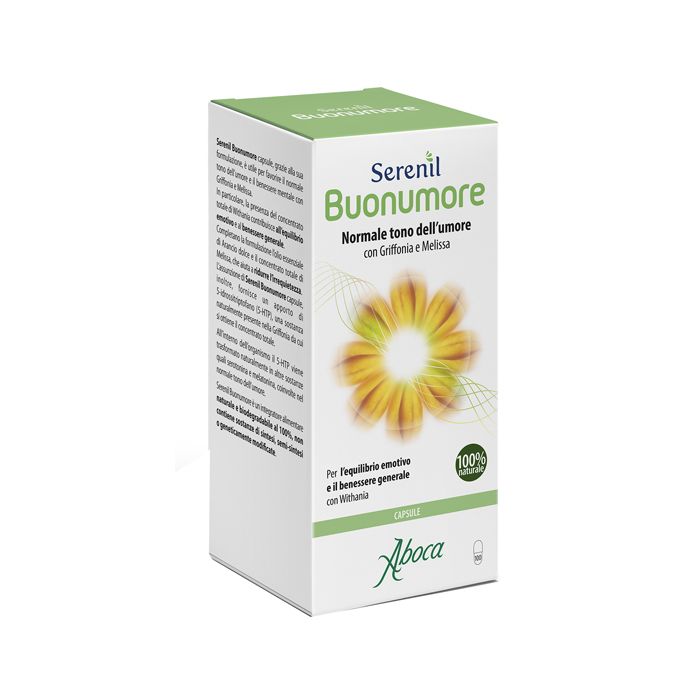 Integratore alimentare naturale e biodegradabile al 100%, utile per favorire il normale tono dell'umore e il benessere mentale con griffonia e melissa. In particolare, la presenza del concentrato totale di withania contribuisce all'equilibrio emotivo e al benessere generale. Completano la formulazione l'olio essenziale di arancio dolce e il concentrato totale di melissa, che aiuta a ridurre l'irrequietezza. L'assunzione di Serenil Buonumore capsule, inoltre, fornisce un apporto di 5-idrossitriptofano (5-HTP), una sostanza naturalmente presente nella griffonia da cui si ottiene il concentrato totale. All'interno dell'organismo il 5-HTP viene trasformato naturalmente in altre sostanze quali serotonina e melatonina, coinvolte nel normale tono dell'umore. Serenil Buonumore non contiene sostanze di sintesi, semi-sintesi o geneticamente modificate.